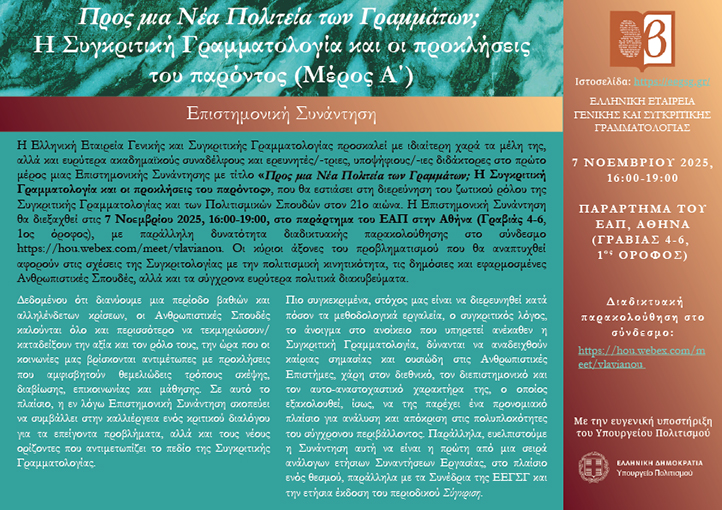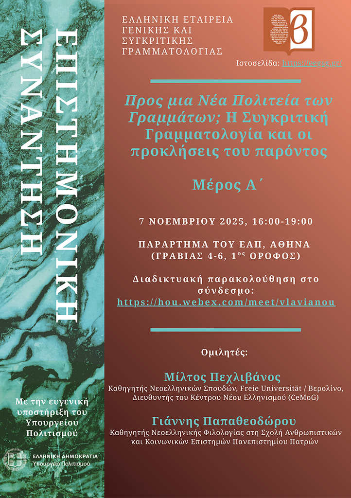 Εν όψει του Η’ Διεθνούς Συνεδρίου της Εταιρείας μας, σε συνεργασία με τη Σχολή Ανθρωπιστικών Επιστημών του ΕΑΠ, που θα πραγματοποιηθεί το τριήμερο 21-23 Μαρτίου στο παράρτημα του ΕΑΠ στην Αθήνα (Γραβιάς 4-6, απέναντι από το βιβλιοπωλείο Πρωτοπορία), σας ενημερώνουμε ότι όσες/όσοι αδυνατείτε να παρακολουθήσετε το Συνέδριο δια ζώσης, μπορείτε να το παρακολουθήσετε εξ αποστάσεως μέσω live streaming, χωρίς δυνατότητα παρέμβασης φυσικά.